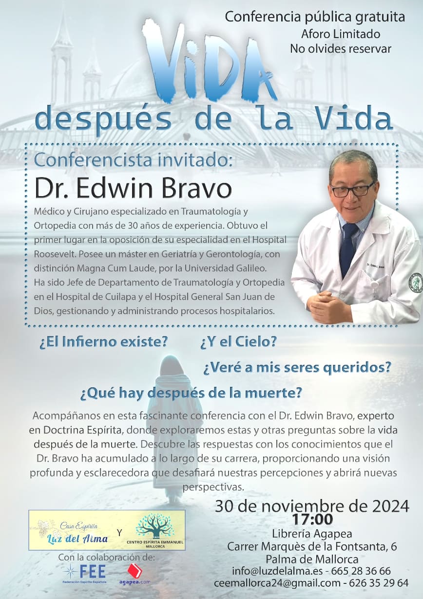 El pasado 30 de noviembre de 2024 tuvimos el privilegio de acoger en Palma de Mallorca la conferencia “Vida después de la Vida”, a cargo del Dr. Edwin Bravo, médico y cirujano con más de 30 años de experiencia y gran conocedor de la Doctrina Espírita.